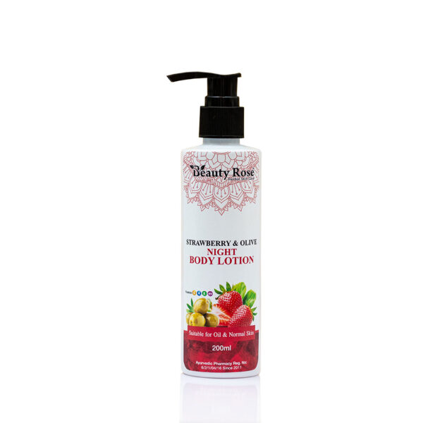 විටමින් ක්ලෑලණ සහ ඊ6 වලින් සපිරි ස්ට්රොබෙරි සහ ඔලිව් තෙල් සාරයෙන් නිෂ්පාදිත නයිට් බොඩිලෝෂන් ඇග ගැල්වීමෙන් සමෙහි තෙතමනය රැුක දී ලප කැලැල් නොමැති නිරෝගී පැහැපත් සුසිනිදු ගතක් ලබා දේ